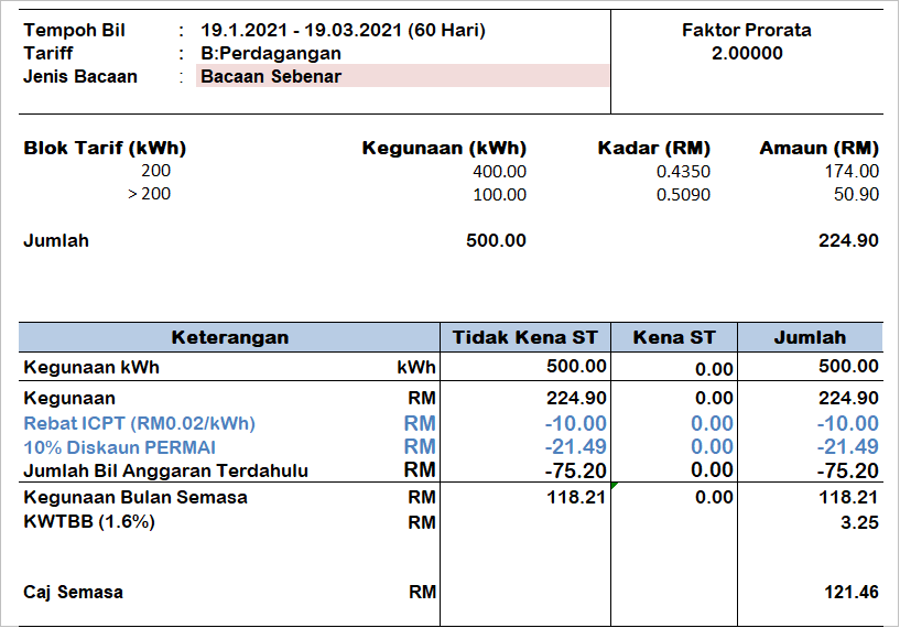 Meter reading taken based on current consumption. Tarif Kategori Unit Kadar. Contoh sekiranya penggunaan elektrik bulanan adalah 300kWj atau RM 7700 maka pengguna akan mendapat diskaun sebanyak 15 ke atas bil mereka.